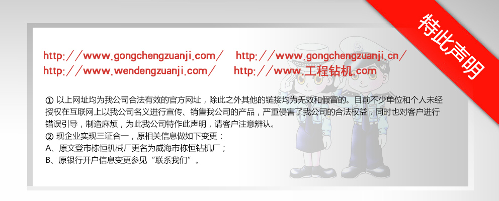 威海市棟恒鉆機(jī)廠隸屬于文登市工程鉆機(jī)廠,主要生產(chǎn)、銷售工程鉆機(jī)。它坐落于文登市西鋪頭工業(yè)園,這里科技發(fā)達(dá),交通便利,制造業(yè)集中。 自1982年建廠以來(lái),經(jīng)過(guò)多年的優(yōu)化改革和沉淀積累,擁有精密、大型加工設(shè)備近百臺(tái)的生產(chǎn)企業(yè)之一?,F(xiàn)在研制成功的GJ-400、GJ-250S、GJ-250A、GJ-240S、GJ-240A、GJ-180S、GJ-180A型等鉆機(jī)。在其它產(chǎn)品上,企業(yè)建立了長(zhǎng)期、中期、短期的發(fā)展規(guī)劃,一系列的高性能產(chǎn)品正在不斷推出中,企業(yè)應(yīng)市場(chǎng)需求對(duì)系列產(chǎn)品進(jìn)行了優(yōu)化組合,開(kāi)發(fā)了與之對(duì)應(yīng)配套的三腿、四腿單天車輪、雙天車輪鉆塔;泥漿泵—BW-160Q、BW- 200Q型球形閥泥漿泵大大提高了泵的使用性能和機(jī)械效率